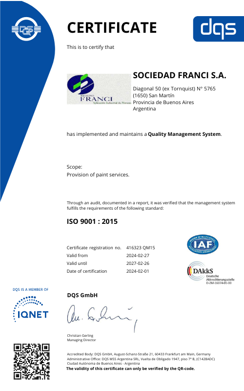 Sociedad Franci fue fundada en 1962 por Luciano Forte y Maria Clara De Lazzer. Luciano fue un inmigrante italiano que llegó a Argentina con una visión innovadora. Su experiencia y dedicación le permitieron posicionarse como referente en el sector, además de convertirlos en pioneros en la introducción de la pintura en polvo en Argentina.